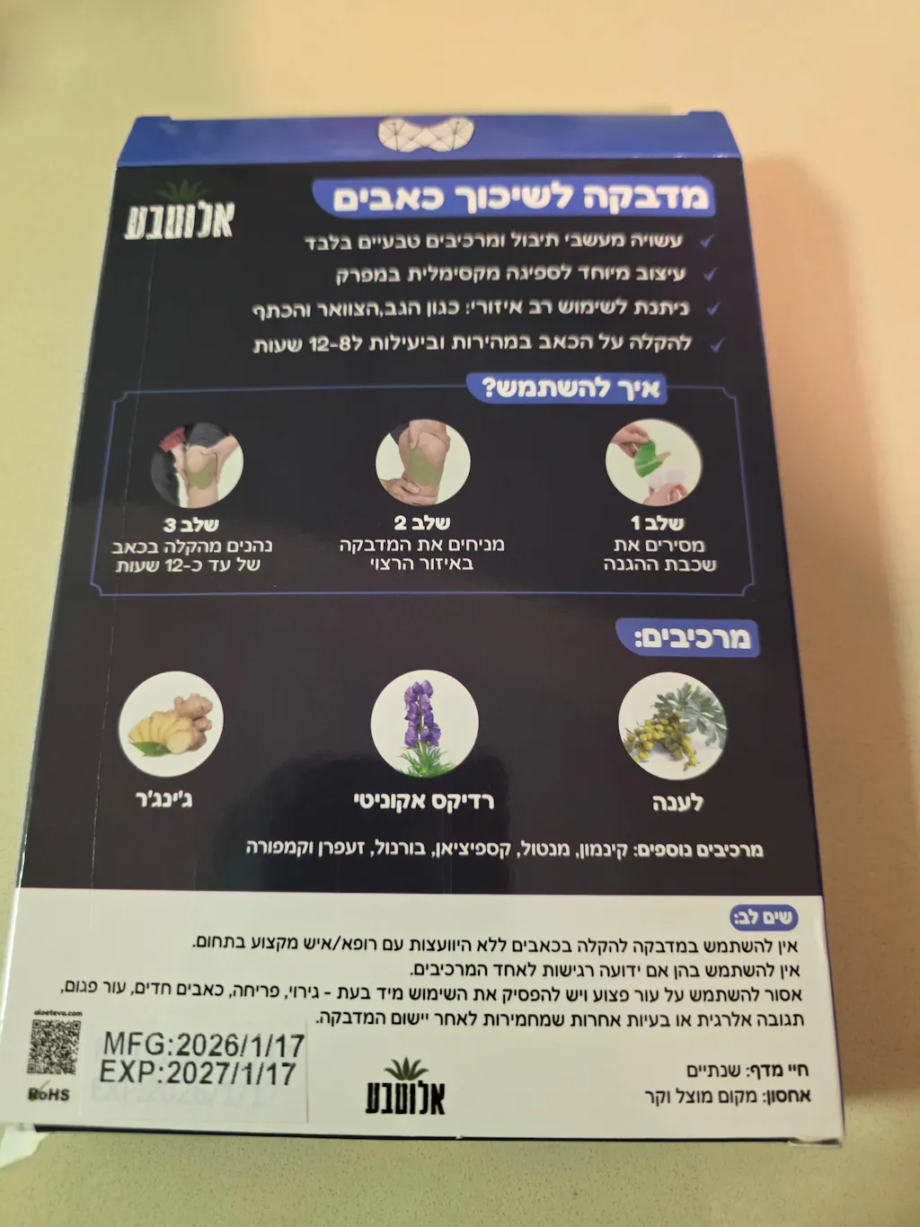 עד כה, הייתה לי לפחות מדבקה אחת שהצליחה להישאר במהלך כל יום העבודה שלי במשך 24 שעות והיא הצליחה להסיר את הכאב שהיה לי בברך בזמן עבודה. המלצתי עליכם והחברות  שלי רצו לקנות.